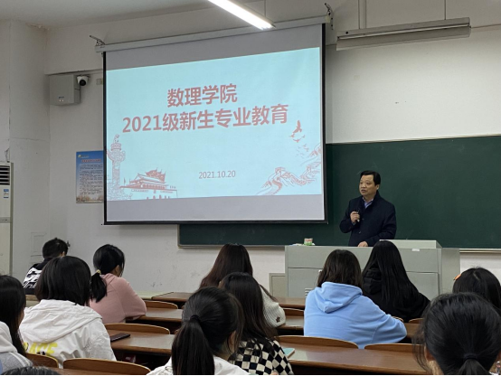 为使新生深入了解专业课程,尽快适应大学生活,明确未来发展方向,2021年10月20日、27日下午,在博学楼D509教室,数理学院为首届本科新生开展系列入学专业教育。数理学院院长薛长峰、党总支书记魏伟华、副院长徐宁、专业负责人、新生班主任、辅导员及2021级全体新生参加。