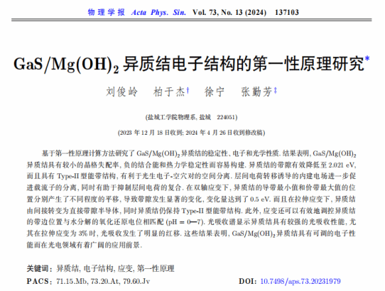 近日,我校数理学院柏于杰老师指导学生刘俊岭基于第一性原理研究了GaS/Mg(OH)2异质结的电子性质。相关结果以“GaS/Mg(OH)2异质结电子结构的第一性原理研究”为题发表在《物理学报》(中科院四区)杂志上。本科生刘俊岭为第一作者,数理学院柏于杰老师为通讯作者。