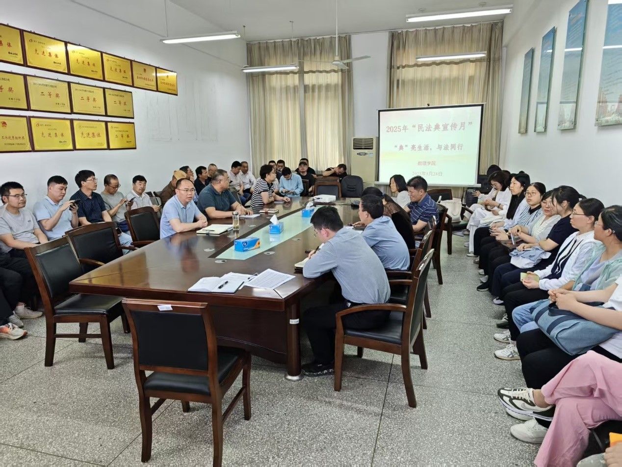 为深入践行习近平总书记关于“广泛开展民法典普法工作”的重要指示精神,切实提升学院师生法治意识、厚植校园法治文化土壤,5 28 日下午,数理学院在博学楼 B512 会议室组织开展 "" 亮生活,与法同行民法典专题宣传活动。