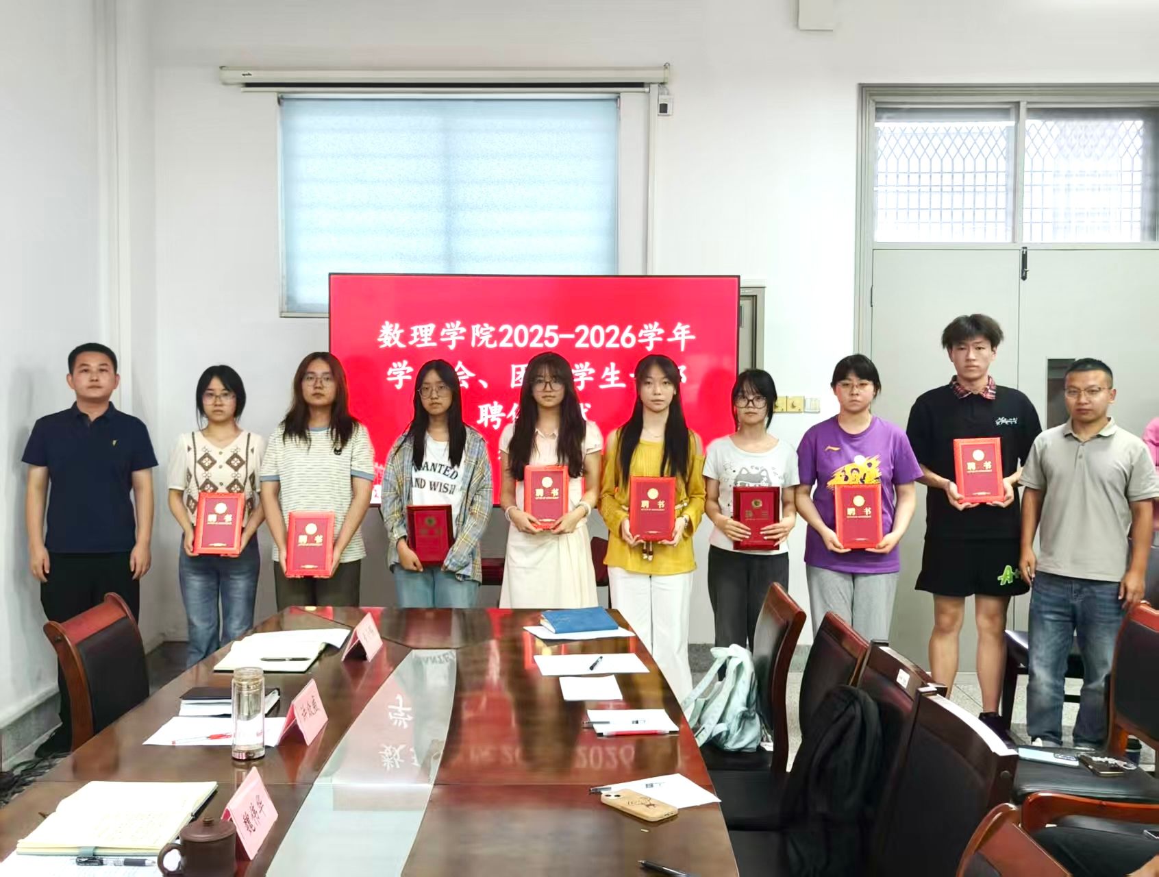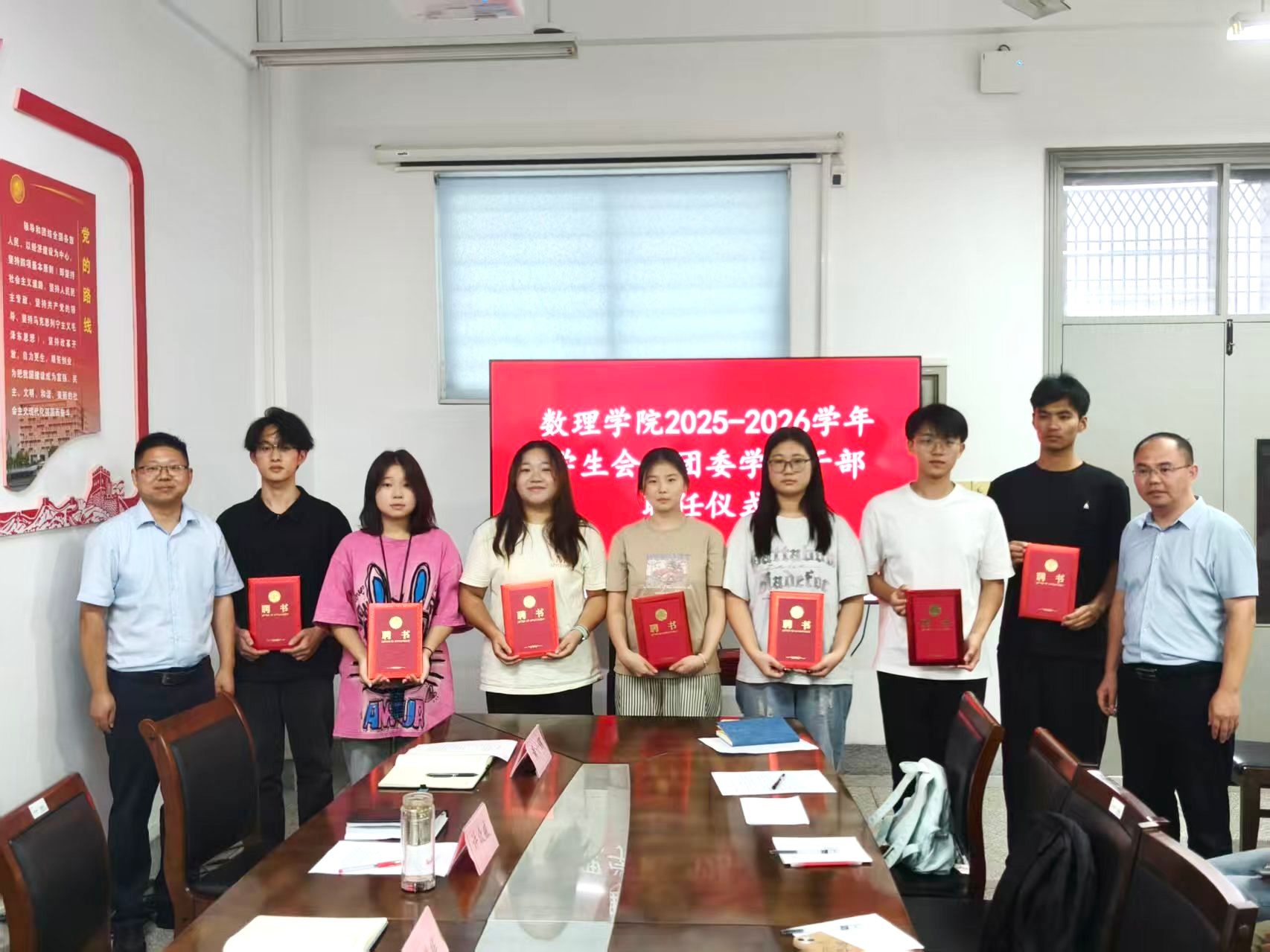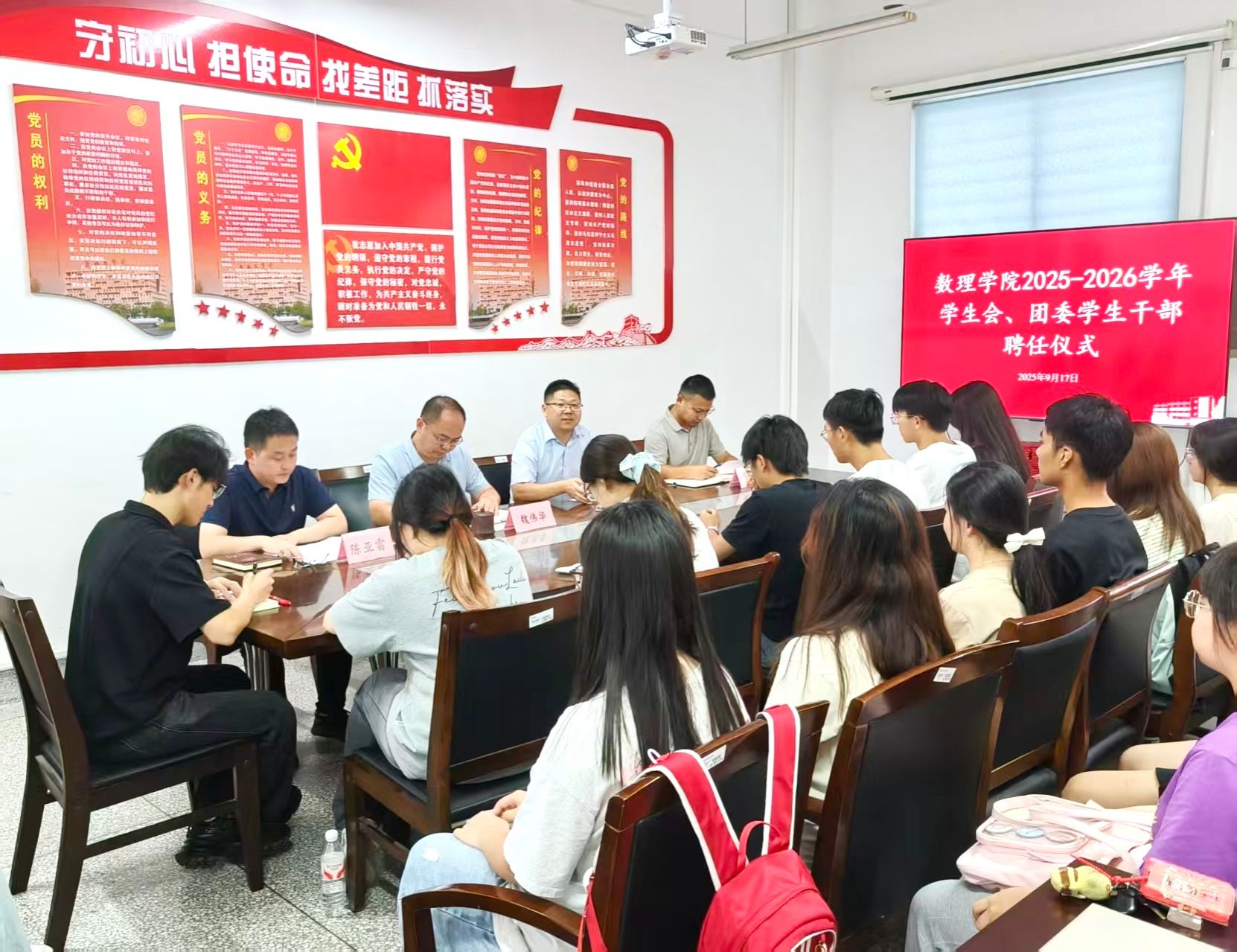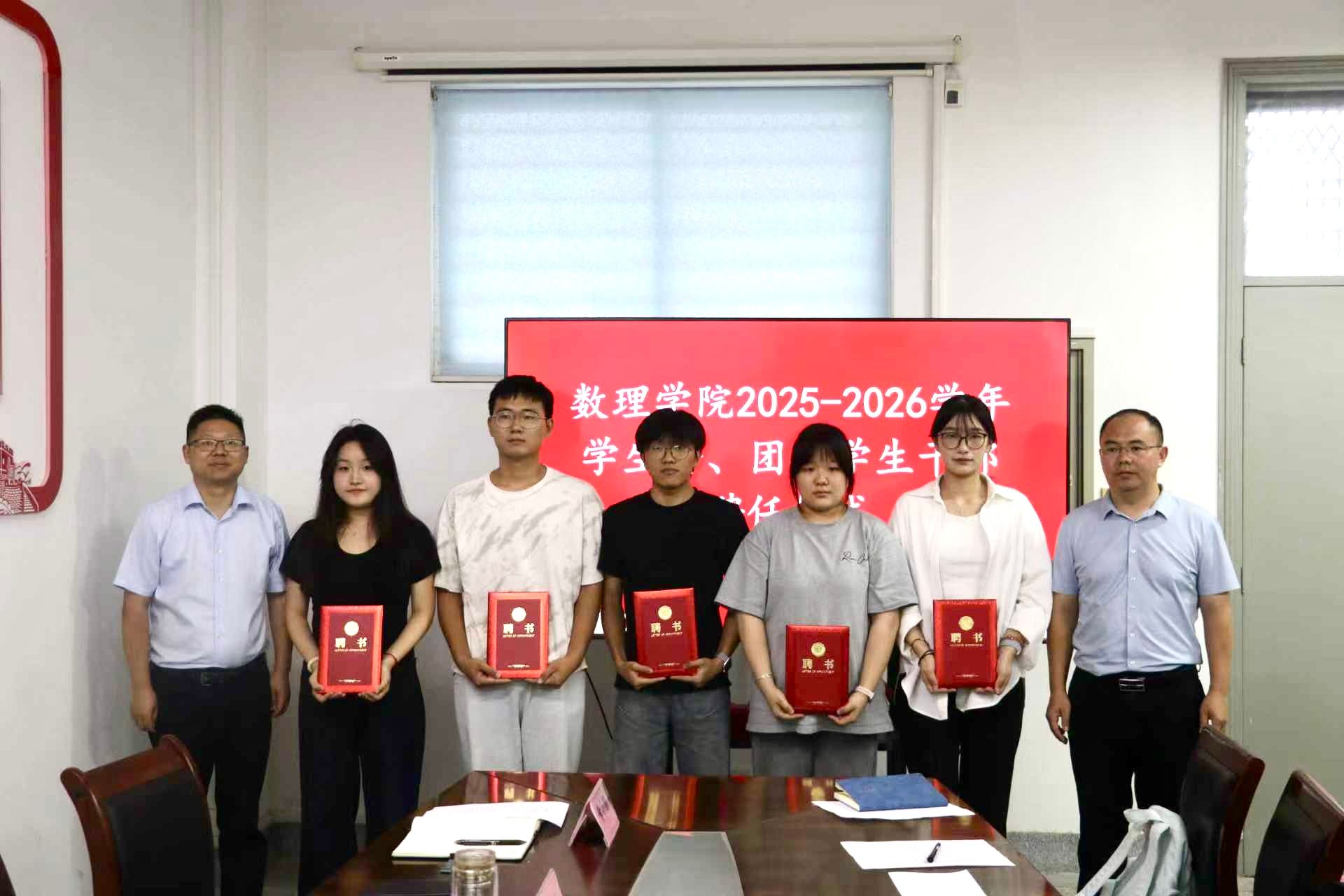9月17日下午,数理学院在博学楼B503举行第四届学生会、团委学生干部聘任仪式。学院党总支书记魏伟华、团委副书记陈亚雷、辅导员黄小钢及第四届全体学生会、团委学生干部参加。仪式由学院党总支副书记许众威主持。