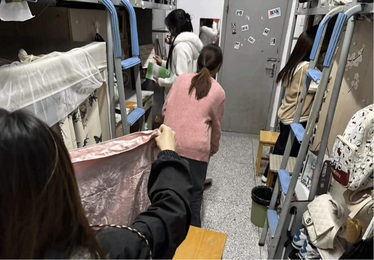 活动期间,各宿舍迅速响应,同学们热情投入,现场一派热火朝天的劳动景象。在打扫洁净的基础上,大家更展露出无限的巧思妙想:有的宿舍秉持“绿色环保”理念,将废旧物品“变废为宝”,制成独具匠心的装饰摆件;有的则精心打造“书香雅室”,以书籍字画为伴,满室墨香,文化气息扑面而来;更有宿舍用一张张合影、一句句手写寄语,筑起一道“温情墙”,定格下属于彼此的青春记忆与温暖瞬间。
